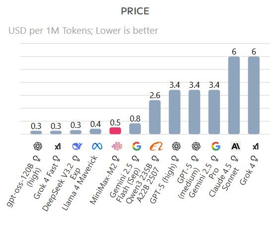MiniMax M2 costs around $0.30 per million tokens input and $1.20 per million tokens output, offering high throughput (~100 tokens/sec). Its efficient design reduces operational expenses while maintaining strong AI capabilities.